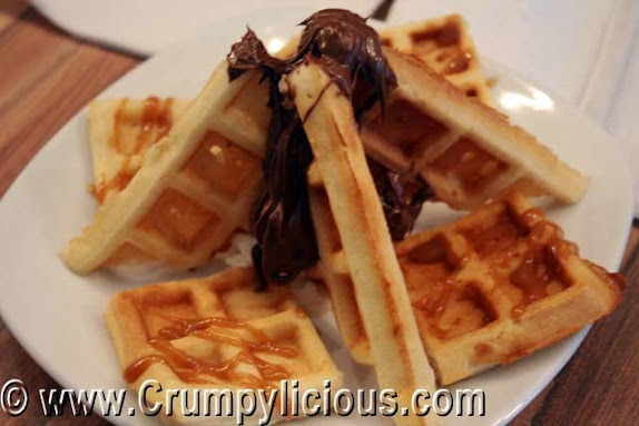 Belgian Waffles is a bit thicker than the ones above. It is smudged with Nutella, glazed with caramel and laid on a scoop of whipped cream.